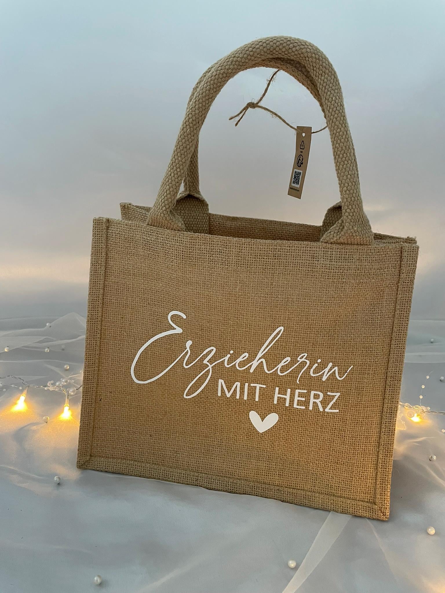 Jute-Tasche Erzieherin mit Herz, Erzieher mit Herz, Geschenk Erzieher, Kindergarten, Abschiedsgeschenk