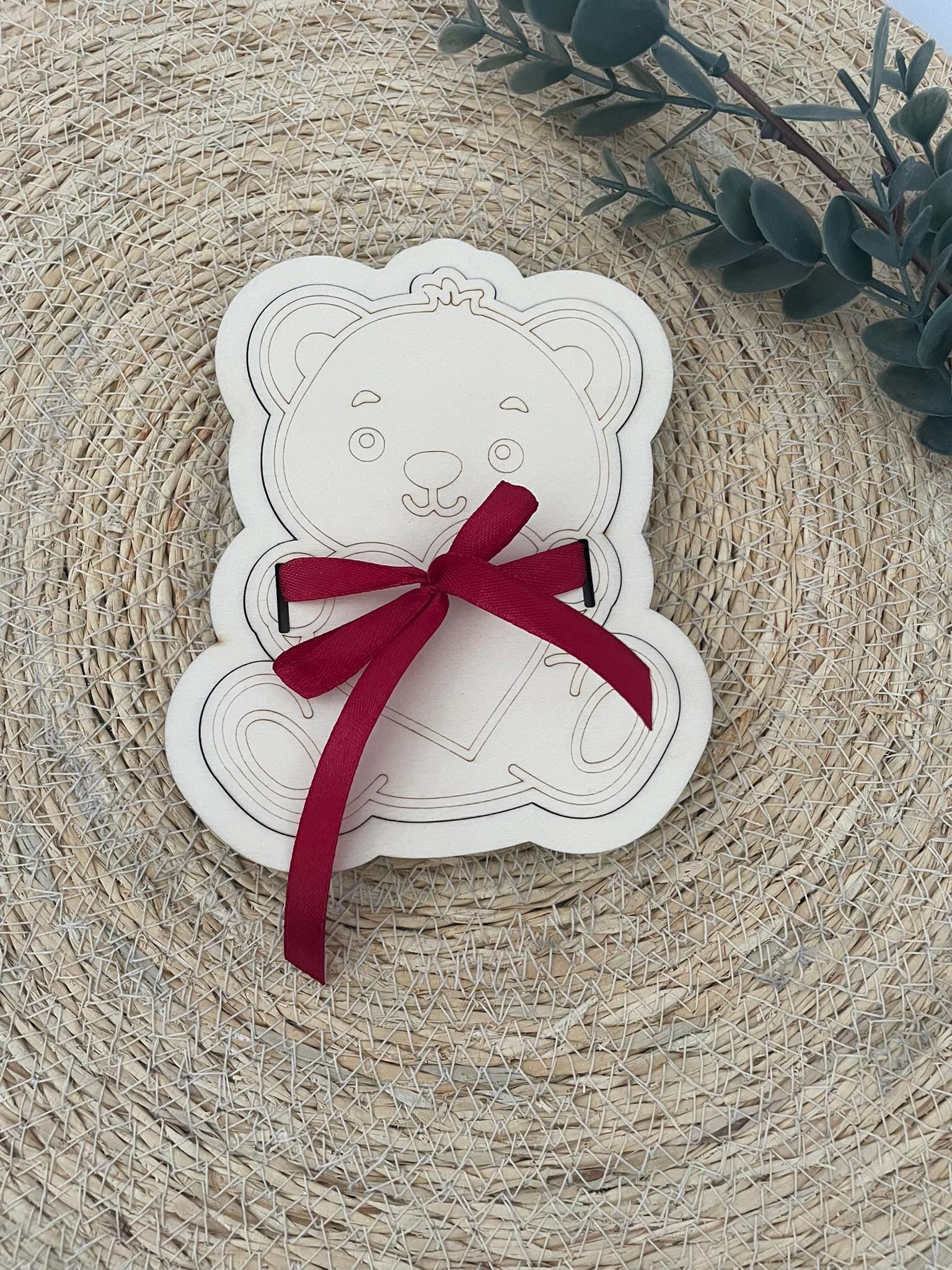 Zauberhafte Geschenkbox aus Holz in niedlicher Bärenform – ideal für Geldgeschenke oder Gutscheine! Perfekt für Babypartys, Taufen, Geburtstage oder andere besondere Anlässe. Diese liebevoll gestaltete Box mit Herz-Detail bietet einen einzigartigen Weg, kleine Überraschungen zu überreichen. Die Kombination aus hochwertigem Holz, einem eleganten roten Band und einer niedlichen Optik macht diese Geschenkverpackung zu einem unvergesslichen Highlight.