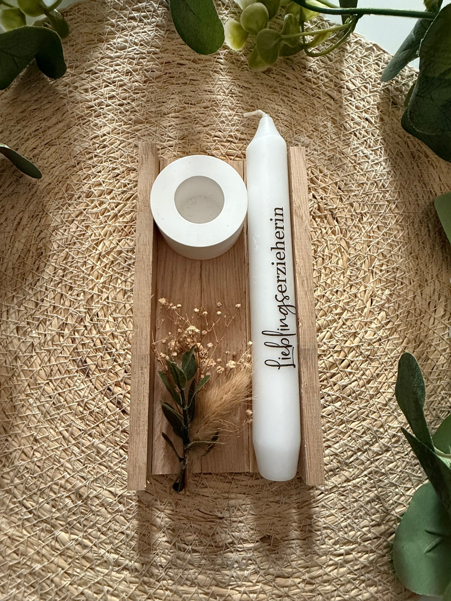 Bitte beachten: bei der Auswahl Verpackung+Kerzenhalte kann der enthaltene kleine Trockenblumenstrauß in Farbe und Art variieren.