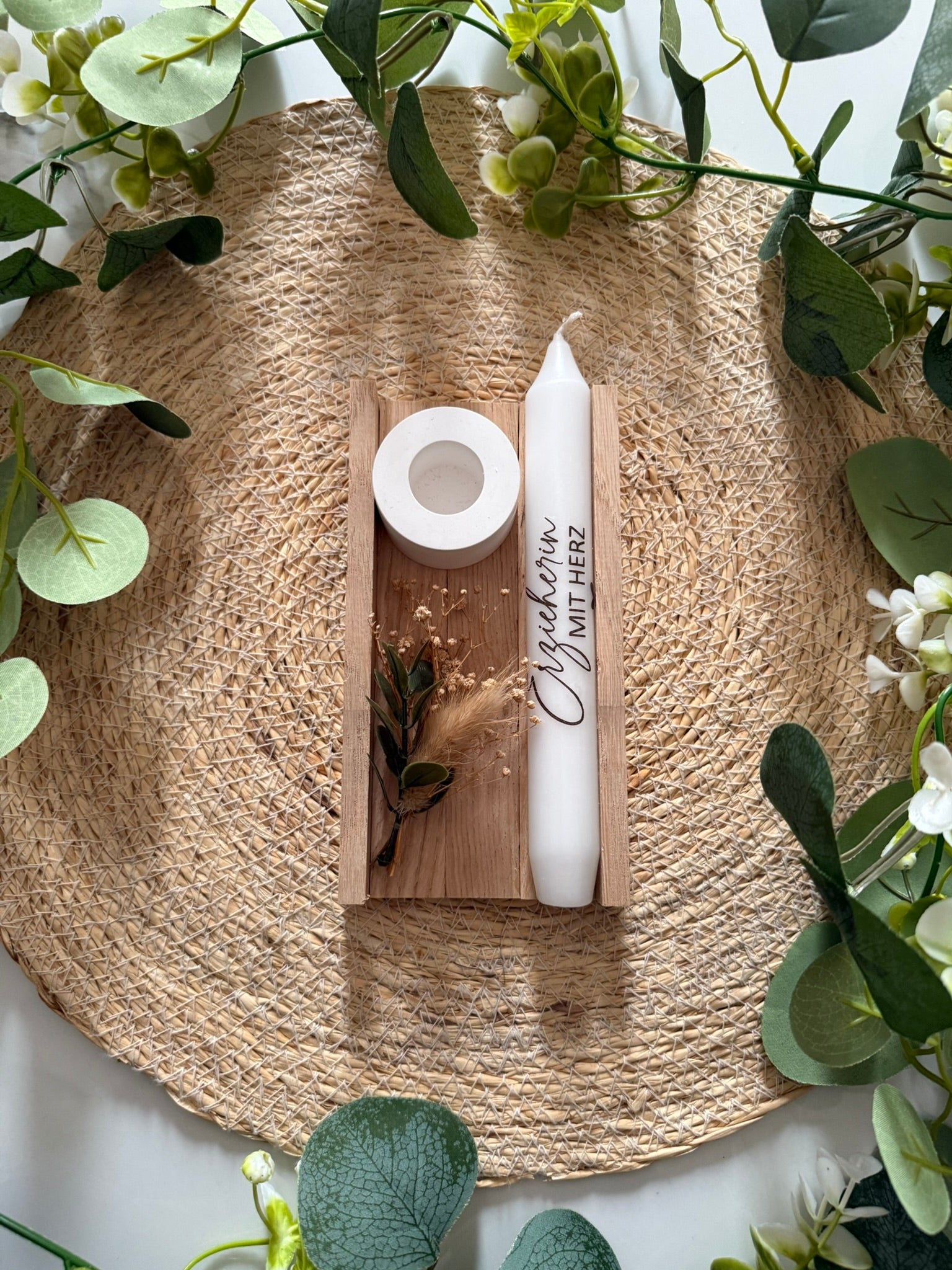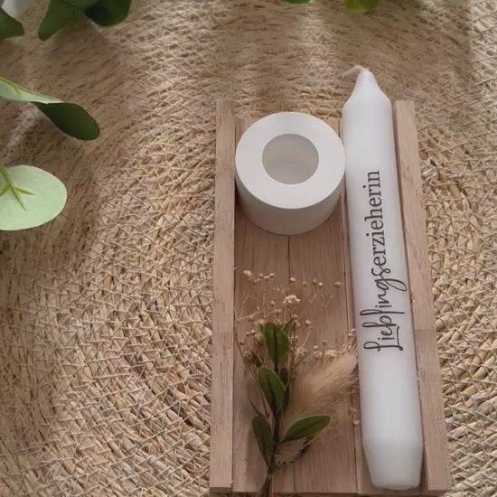 Schenke ein Stück Freude mit unserer liebevoll gestalteten Kerze. Diese zarte weiße Kerze, mit verschiedenen Aufschriften, liegt optional sicher in einem minimalistischen Holzhalter. Sie ist ein wunderbares Geschenk für den Geburtstag, zum Abschied oder um einfach mal Danke zu sagen.