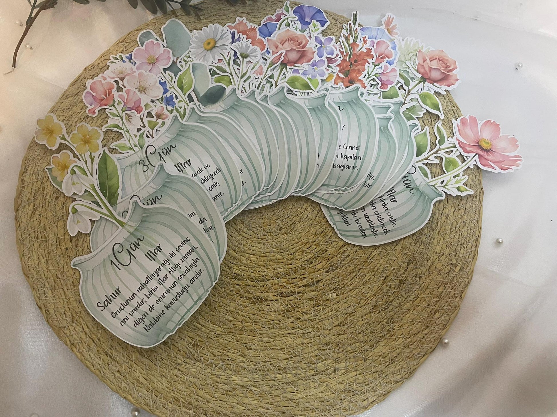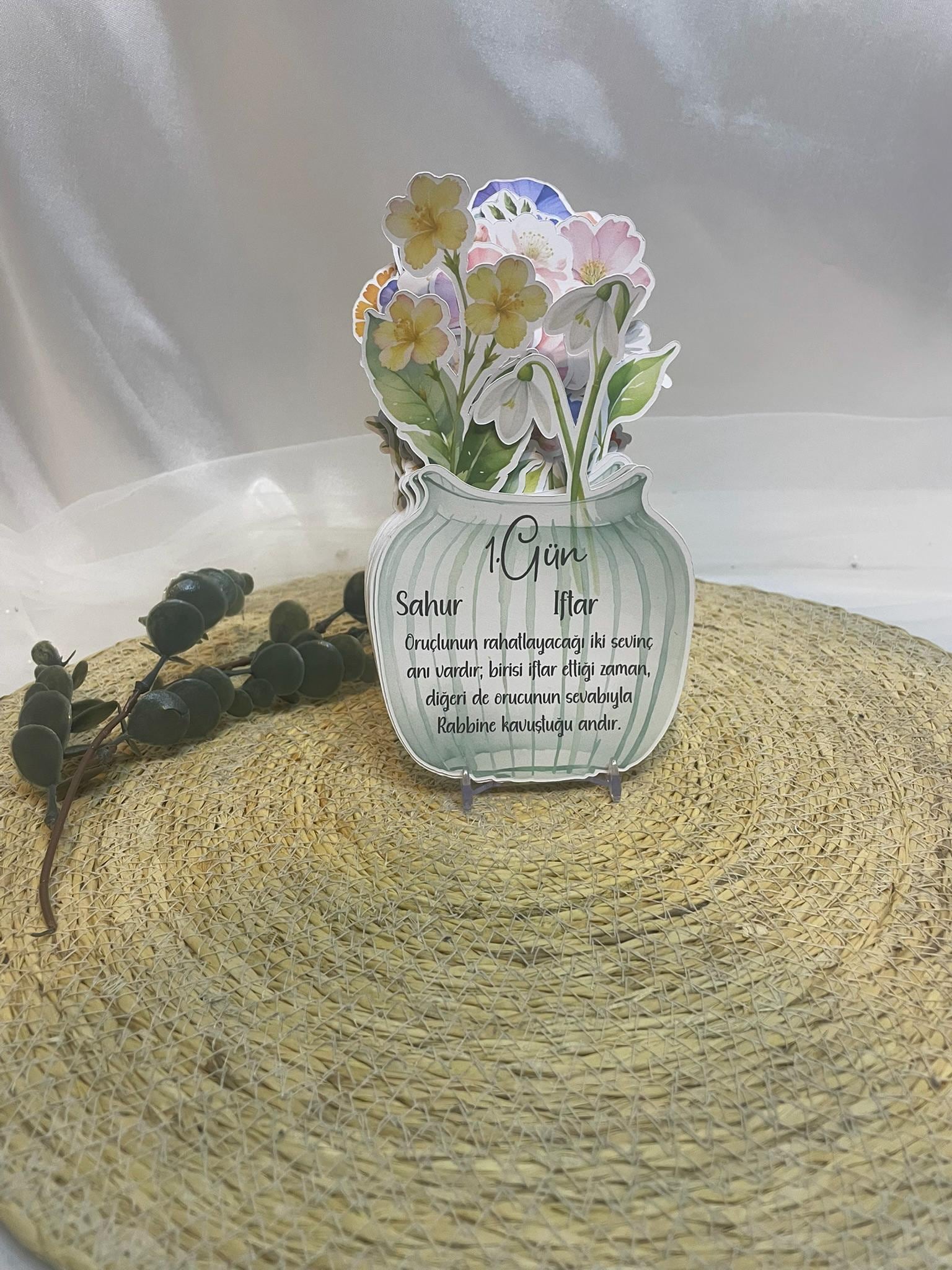 Dieses handgefertigte, filigrane Ramadan-Tagesblatt kombiniert islamische Tradition mit moderner Ästhetik. Das Design zeigt einen dekorativen Blumenstrauß, der aus einem geschwungenen Gefäß emporragt. Es bietet Platz für Sahur- und Iftar-Zeiten, den Tageshinweis (z. B. “1. Gün”) sowie einen passenden Hadith oder inspirierenden Text. Perfekt für die Ramadan-Zeit, um jeden Tag mit Liebe zum Detail zu beginnen.
