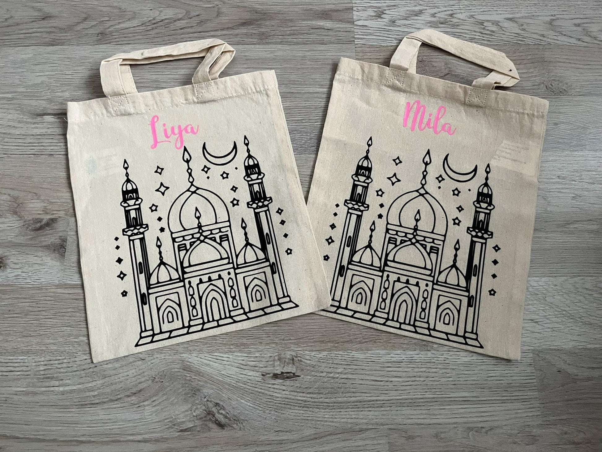 Du möchtest deinen liebsten zu Ramadan oder Eid eine Freude machen? Dann beschenke sie mit unserem Ausmalbeutel mit einem wunderschönen Moschee-Design und Namen.
